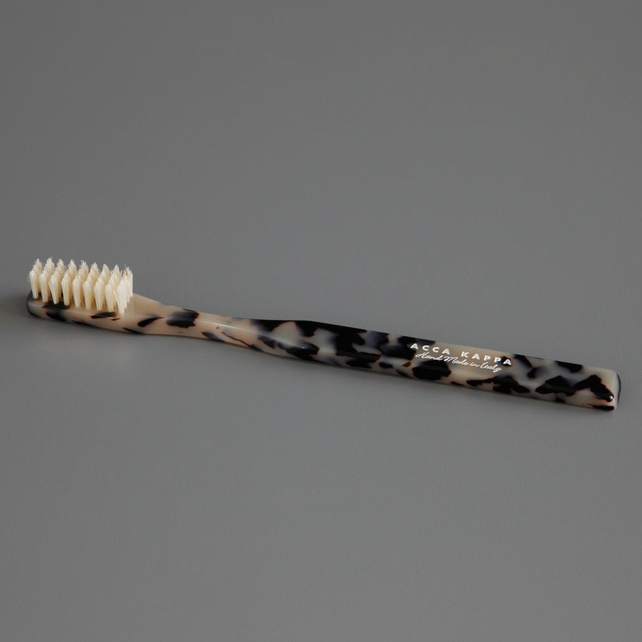 This beautifully crafted toothbrush is made in Italy. Acca Kappa were the first company to produce a toothbrush with a celluloid handle. The brush has nylon bristles, and comes in a clear box for travel.