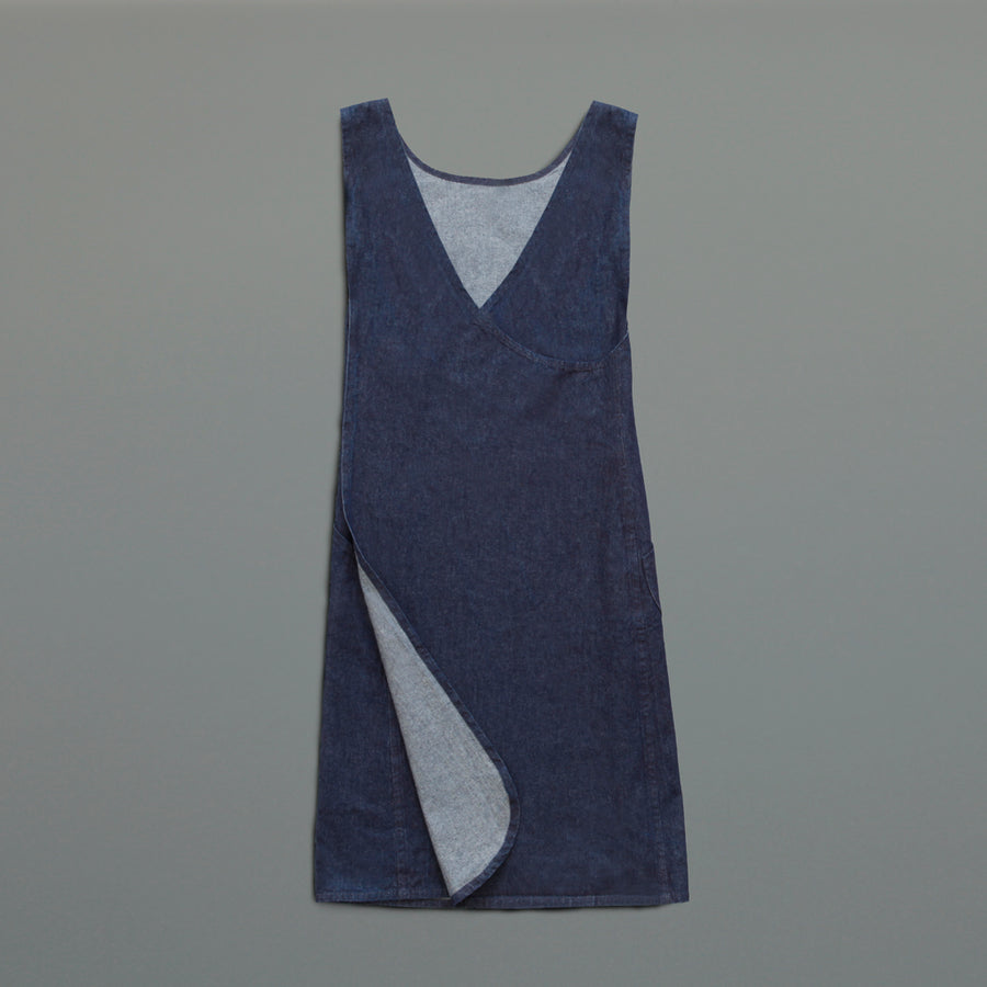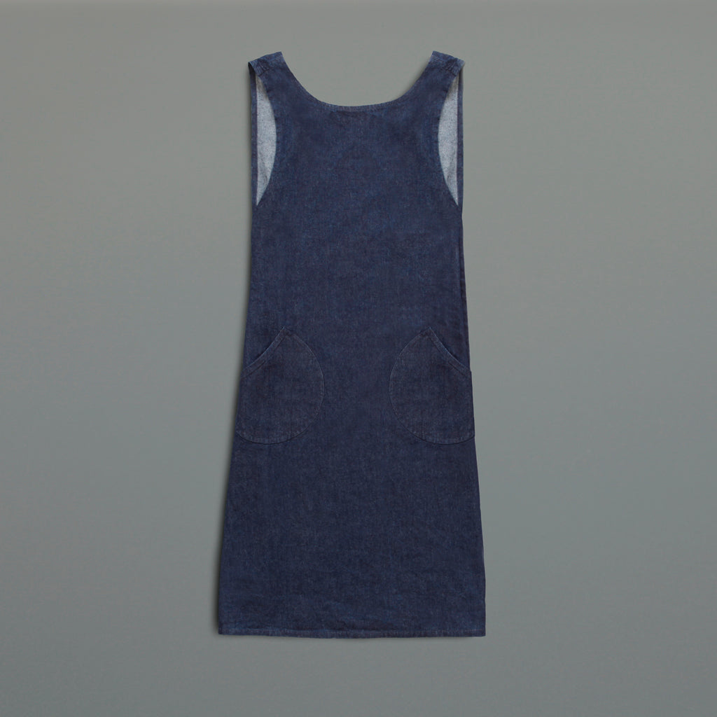 This popular apron style pinafore dress is made in Norfolk, England by our friends at 'Old Town'. The dress has two rounded patch pockets, and simply crosses over at the back.