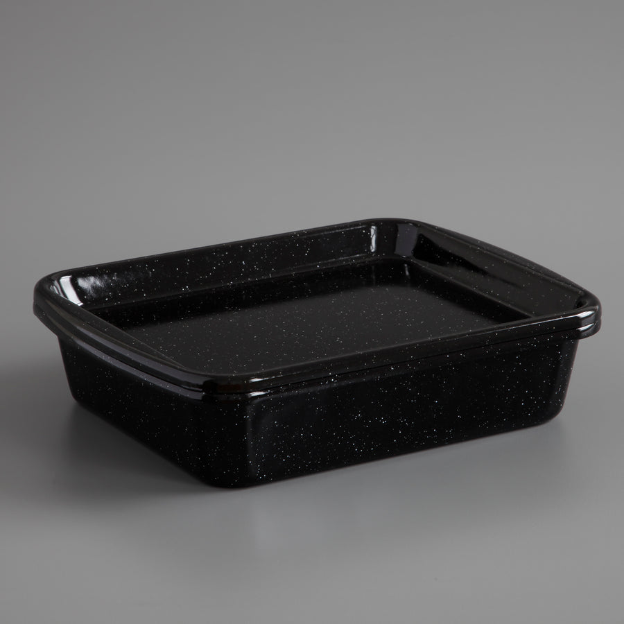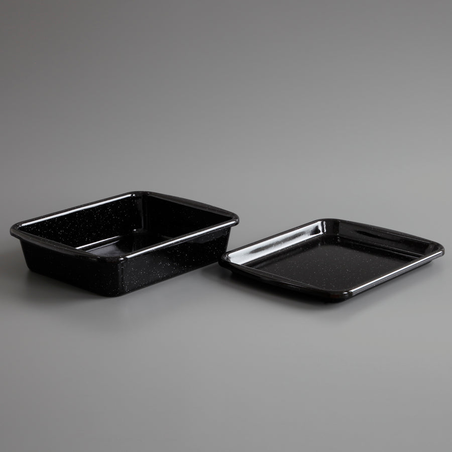 This 2 piece enamel baking set comprises a baking dish and lid which also functions as a baking tray.