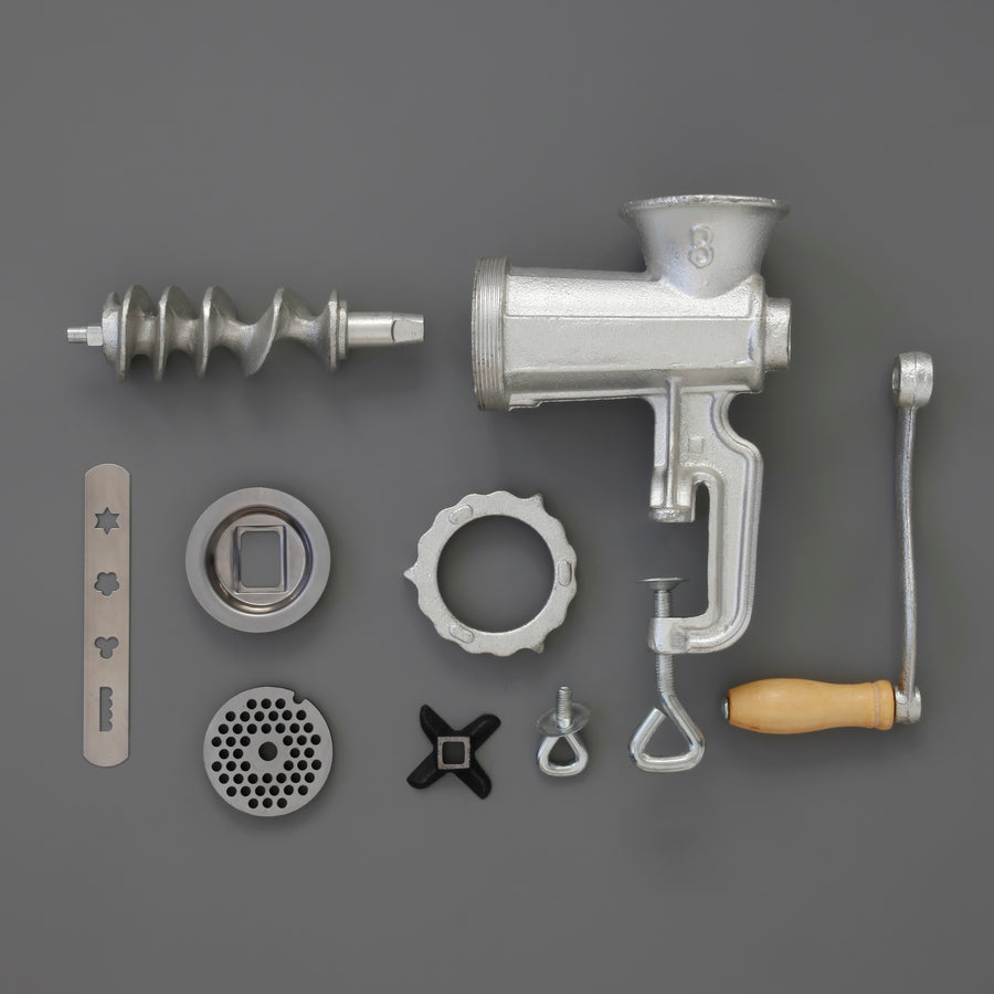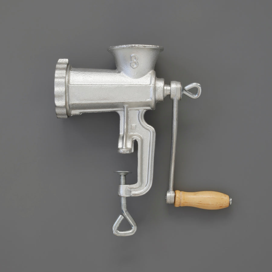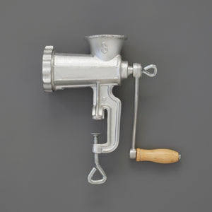 A heavyweight traditional mincer, made from tin plated cast iron. Also included is an attachment for making biscuits (yes, really!)