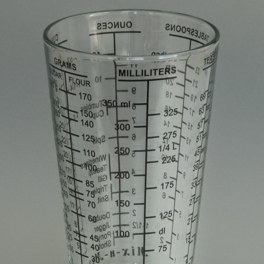 The clearly marked increments show ounces, grams, litres, teaspoons, tablespoons and cups, as well as some lesser known measurements.
