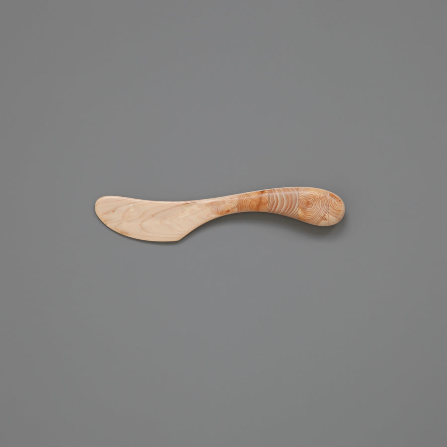 A humble butter knife beautifully crafted from juniper wood. These knives are frequently used in Swedish homes. The handle is covered in sections of end grain wood, giving a satisfying grip. Wooden knives such as this, with their tactile feel and distinctive aroma, create a delightful sensory experience when spreading butter onto bread.