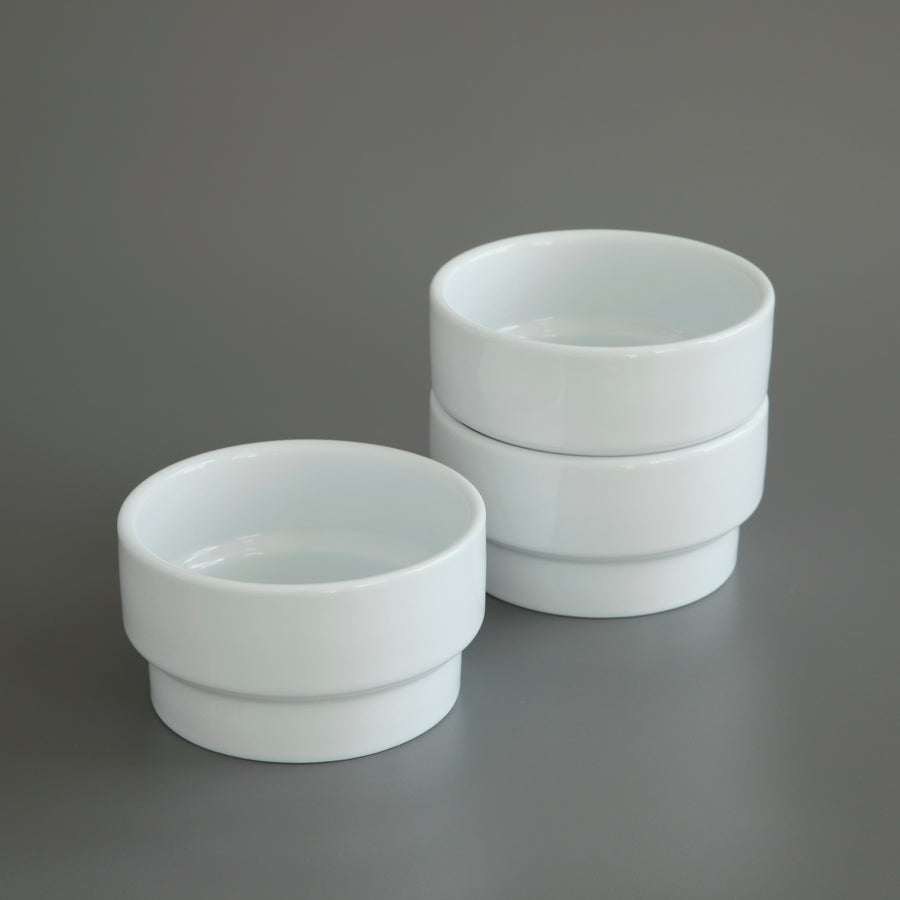 These ramekins or sugar bowls were designed as part of a system of stackable crockery by Nick Roericht in 1959 as his final thesis at the Ulm School of Design. The School was founded by former Bauhaus student Max Bill with many of its ideals, but with a more utilitarian style.