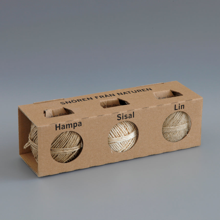 A set of three natural twines from Sweden. Each pack contains 30m of Hemp, 30m of Sisal and 55m of Flax. Useful, and we believe, beautiful.